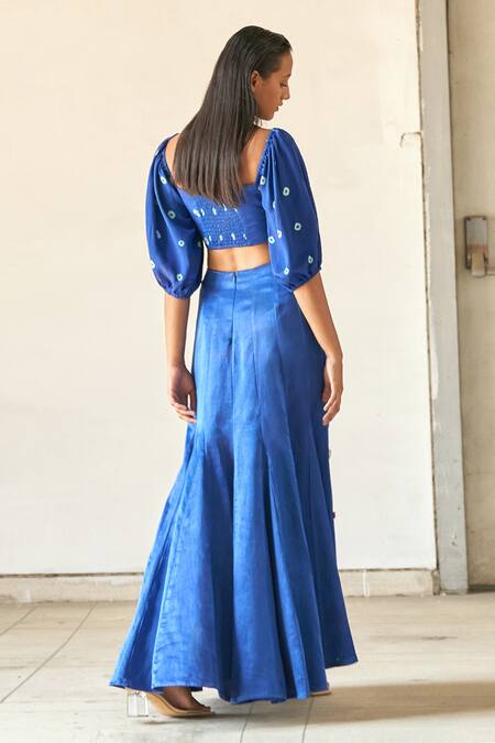 Blue Silk Square Neck Maya Bandhej Print Top And Skirt Set