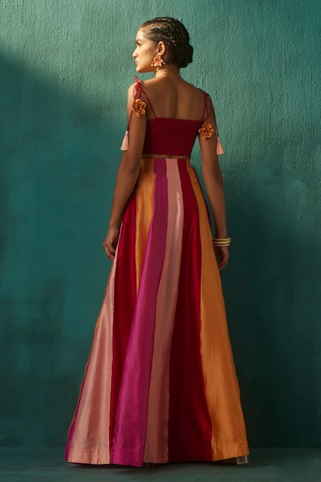 Multicolor chanderi lehenga with panels and slit in front. Comes with gota embroidered padded bustier and organza dupatta.