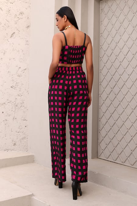 Black and pink bustier featuring a square neckline and checkered hand block print. Paired with matching pants that have front hip pockets.