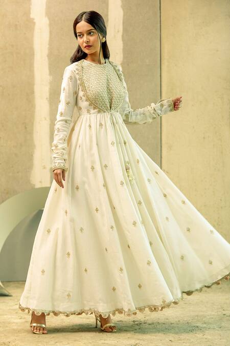 Buy_Aariyana Couture_White Chanderi, Cotton Embroidery, Gota Patti Round Neck Anarkali Set_Online_at_Aza_Fashions
