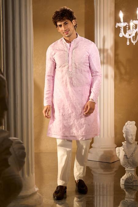 Lilac kurta made from organza featuring intricate embroidery and a mandarin collar. Paired with off-white Aligadhi pants crafted from cotton silk.