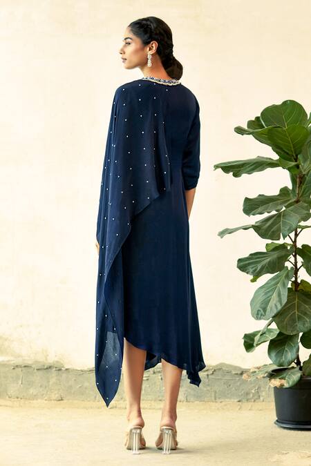 Blue Modal, Satin, Crepe Embroidery Collared Draped Asymmetric Tunic