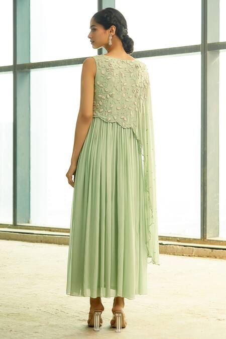 Buy_Aariyana Couture_Green Modal, Crepe Embroidery Round Neck Draped Tunic_at_Aza_Fashions