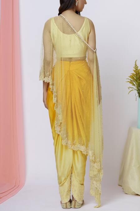 Yellow cape set featuring a sleeveless blouse with a leaf neckline. Paired with dhoti pants embellished with cutdana and pearl embroidery.