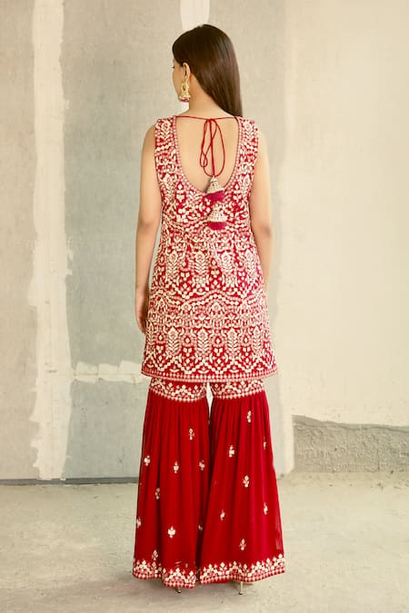 Red Georgette Embroidery, Tassels Round Neck Kurta Sharara Set