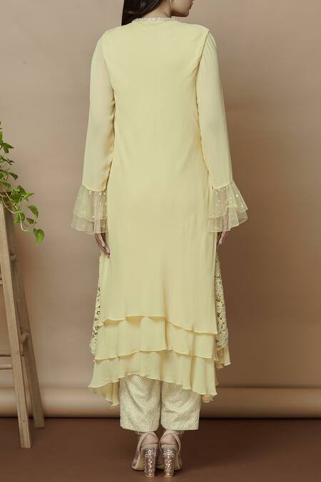 Yellow asymmetrical kurta featuring a floral net layer and pearl & sequin embroidered neckline. Paired with embroidered straight pants with a semi-elasticated waistband and side zip & hook closure.