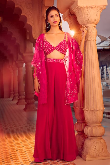 Hot pink floral hand embroidered cape featuring a V neck bustier and a sharara. The cape is made of silk organza while the bustier and sharara are crafted from viscose crepe.