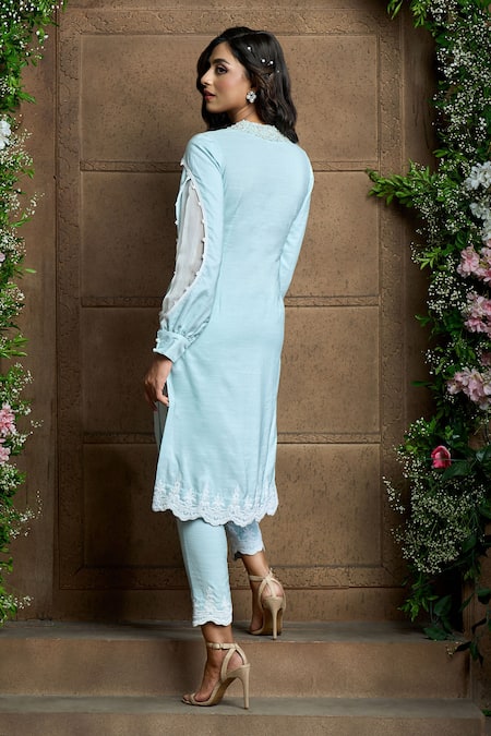 Powder blue kurta featuring full sleeves, V neckline, and pearl & flower embroidery. Paired with a pant adorned with floral lace detailing and scallop cut-work border.