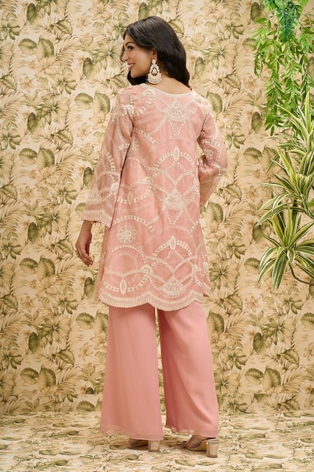 Shop_Aariyana Couture_Peach Organza, Viscose, Georgette Embroidery Round Jaal Kurta And Flared Pant Set