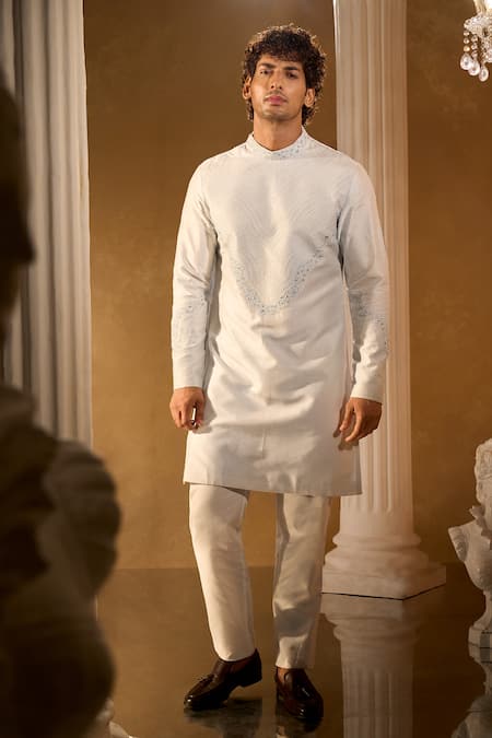 Light blue kurta made from silk blend featuring intricate embroidery. Paired with off-white aligadhi pants crafted from cotton silk.