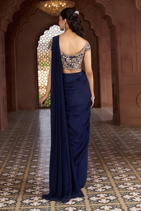 Navy blue pre-draped saree paired with a floral and geometric embroidered off-shoulder blouse. Features cap sleeves and a side zipper closure on the blouse.