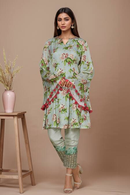 Pastel blue flared kurta featuring all-over floral print and placement embroidery. Paired with off white straight pants embellished with embroidered hems.