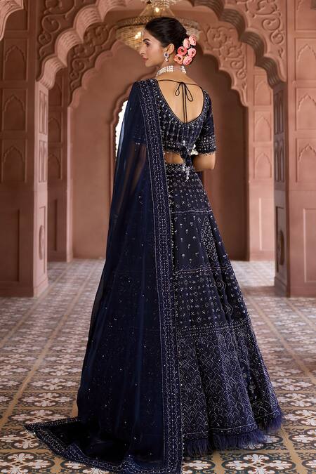 Midnight blue lehenga featuring intricate thread and sequin embroidery. Paired with a matching blouse and viscose organza dupatta.