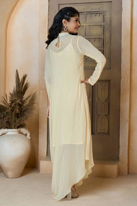 Beige asymmetric tunic featuring hand embroidery with cutdana, pearls, and sequins. Paired with a sleeveless inner slip dress and designed with a mandarin collar and side zipper closure.