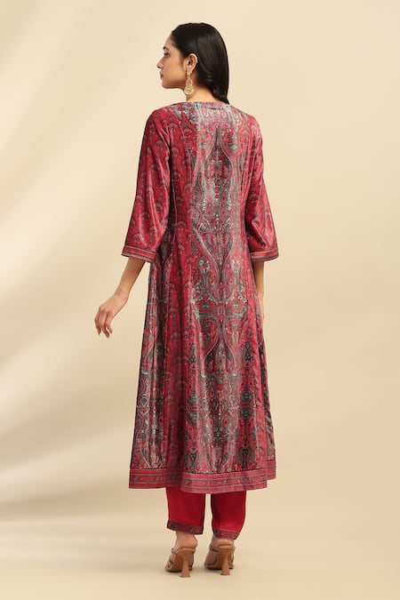 Deep pink anarkali featuring ornate paisley print and three fourth sleeves. Paired with a pant and a glittery striped dupatta.