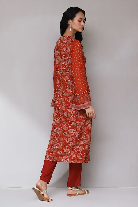 Orange floral printed kurta featuring a round neckline and bell sleeves. Paired with matching pants and a contrasting dupatta.