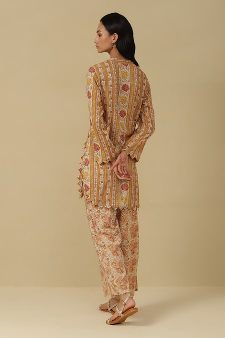 Mustard floral printed kurta featuring an apple hem cut and straight sleeves. Paired with matching printed pant for a coordinated look.