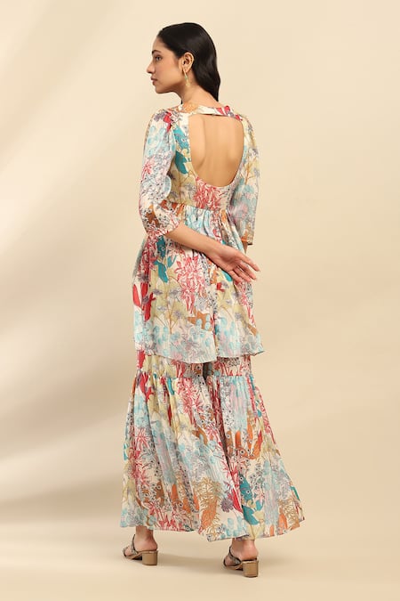 Cream Polyester Embroidery Round Neck Botanic Blossom Print Kurta Sharara Set