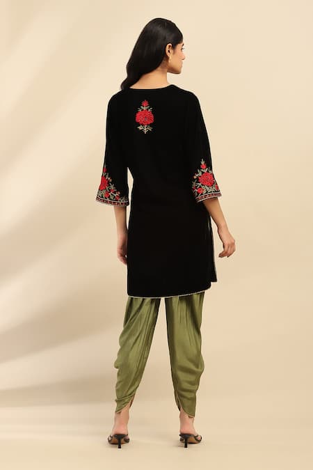 Black kurta featuring Mughal flora embroidery with three fourth sleeves. Paired with a green salwar pant and a gota lace embellished dupatta.