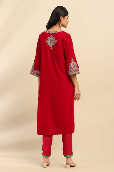 Pink Polyester, Cotton Embroidery V-neck Flora Vine Kurta Set