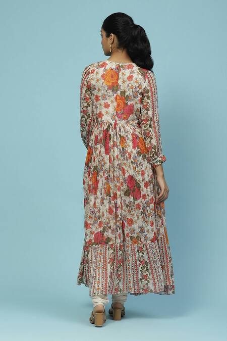 Beige floral printed anarkali featuring a round neckline and three-quarter sleeves. Paired with a churidar and a tassel-edged dupatta.