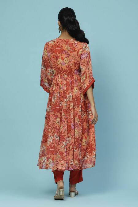 Buy_Ritu Kumar, Ri.Ritu Kumar, aarke Ritu Kumar_Orange Rayon, Chiffon Tassels V-neck Botanic Print Anarkali Set_at_Aza_Fashions