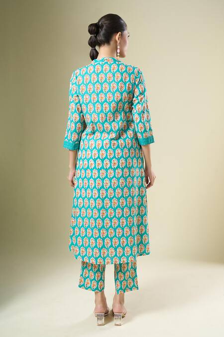 Green Cotton Split V-neck Printed Kurta And Pant Set