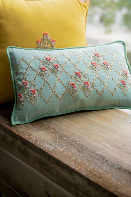 Rectangle shaped, Floral & mughal jaal motif embroidery, Size: (inch): 16 x 12, Closure: Back zipper, Note: Single piece only; Inner pillow insert & the yellow & pink pillows, and the orange cloth is not for sale