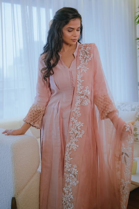 Onion pink chanderi silk kurta featuring intricately smocked sleeve detail. Paired with embroidered hem pant and a pearl embroidered border dupatta.
