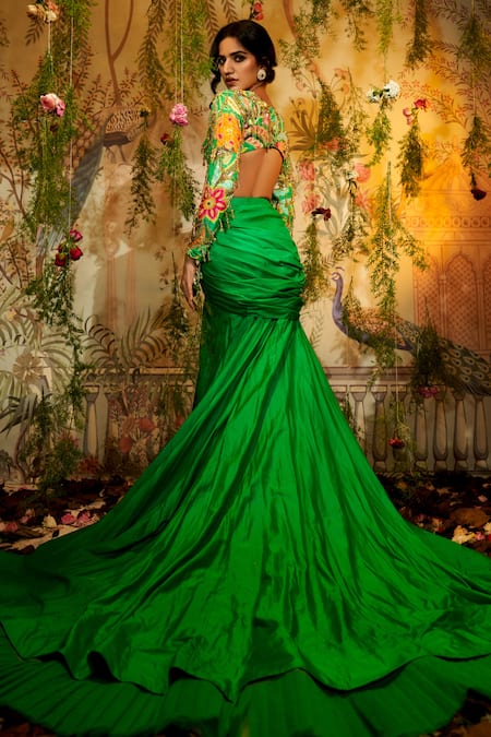 Green padded blouse featuring floral hand embroidery and crystal tassels. Paired with an asymmetric drape skirt with a long trail.