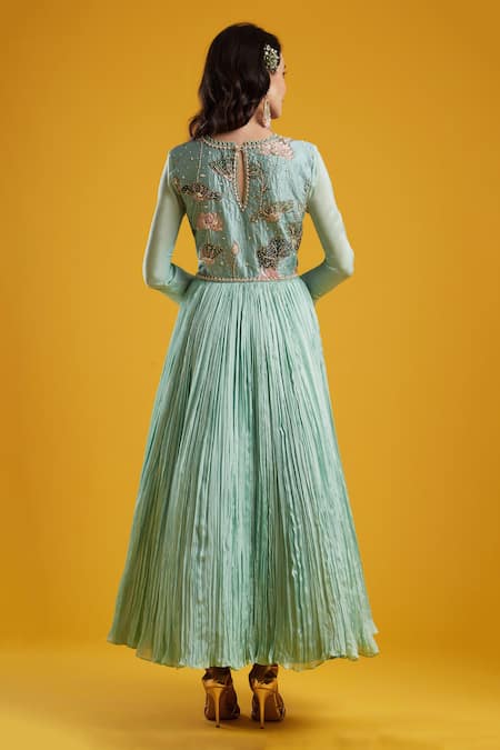Aqua anarkali with floral printed, embroidered motifs. Paired with churidar & embroidered dupatta.