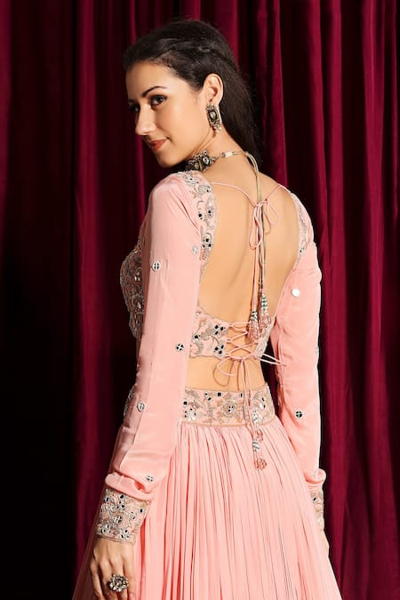 Blush lehenga with gathered detail, floral motif hem & embroidered waistband. Paired with floral embroidered full sleeve blouse & scallop dupatta.