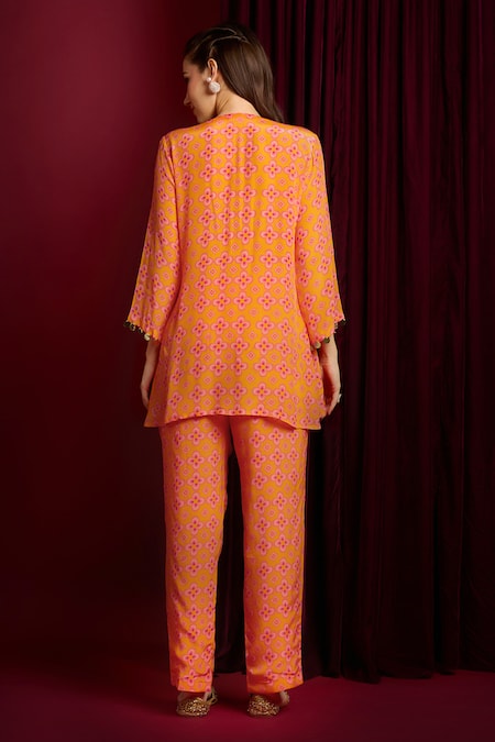 Orange Crepe, Silk Beads, Sequins Geometric Floral Print Short Kurta With Pant