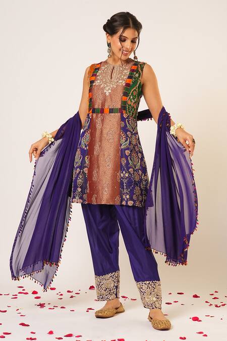 Multi color A-line short kurta featuring banarasi woven floral zari, beads, and stones patchwork embroidered detailing. Paired with solid embroidered hem pant and tassel embroidered dupatta.