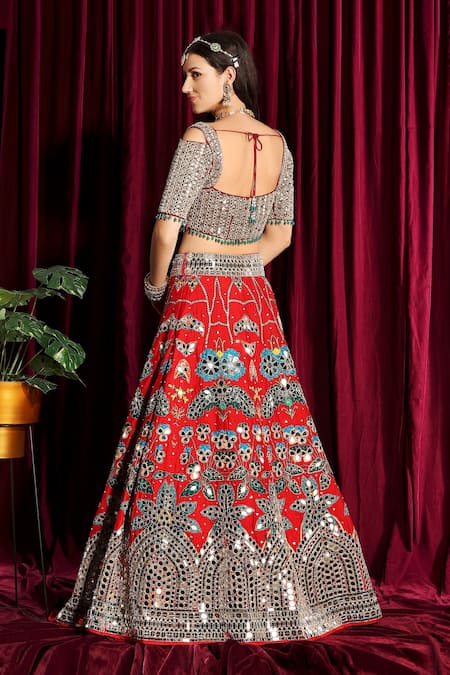 Red lehenga with floral motifs & mirror embroidered motifs. Paired with mirror embroidered, cutout sleeve blouse & organza scallop dupatta.