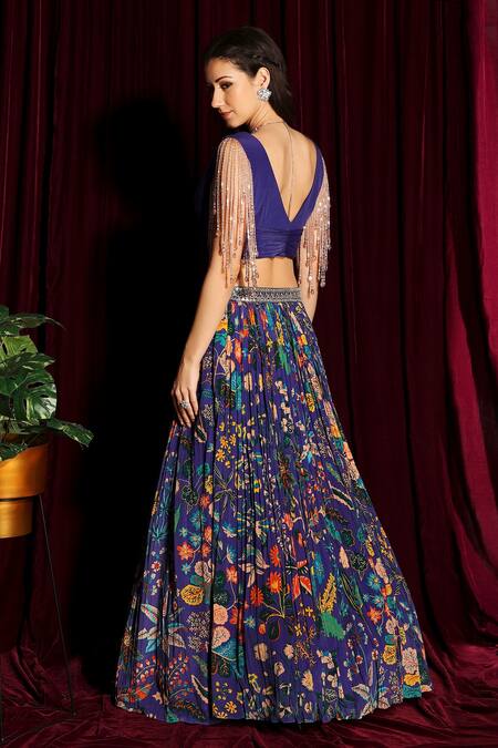 Purple lehenga with gathered detail, floral printed motifs & embroidered waistband. Paired with tassel sleeves blouse & scallop dupatta.