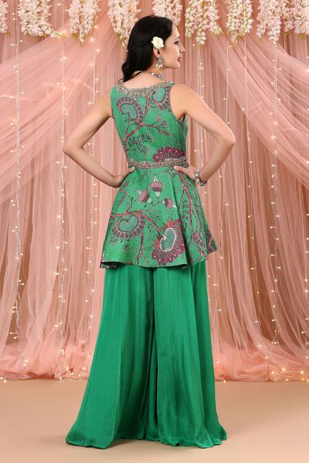 Jade green floral print peplum kurta with embroidered detail. Paired with solid crepe silk gharara.