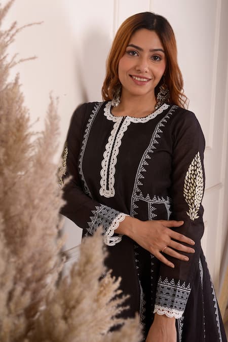 Buy_Abbaran_Black Chanderi, Cotton, Organza Lace, Block Print Anarkali Palazzo Set _at_Aza_Fashions