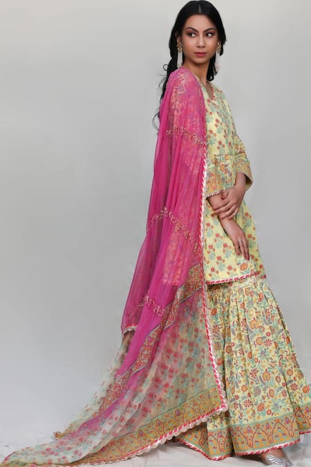 Yellow short kurta with hand block printed motifs, lace and gotta detailing. Comes with gharara pants & ombre dual-tone chiffon dupatta.
