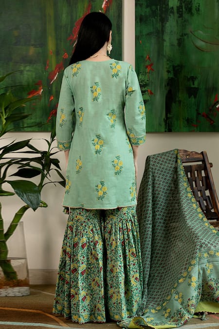 Green Cotton Cambric Dupatta Mulmul V Neck Block Print Kurta Gharara Set