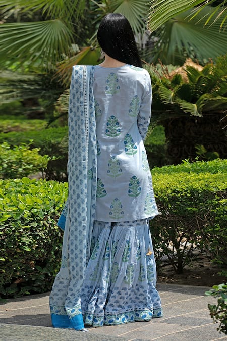 Ice blue straight short kurta with all-over hand block printed motifs, mirror work & gota detailing. Comes with gharara pants & mulmul dupatta.