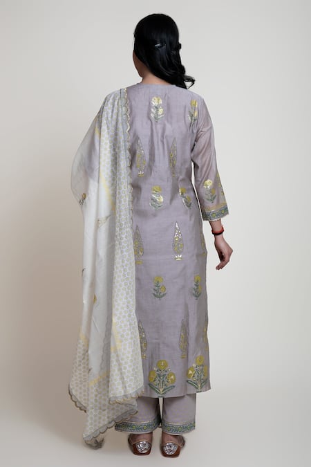 Grey Chanderi, Cotton Cambric Block , Foil Round Kurta Palazzo Set
