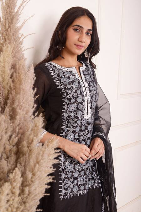 Black chanderi kurta featuring a front floral block print panel highlighted with lace. Paired with a cotton palazzo and an organza dupatta.