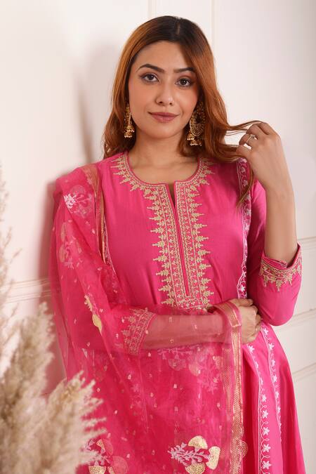 Buy_Abbaran_Pink Chanderi, Organza, Cotton Floral Block Print Anarkali Palazzo Set _at_Aza_Fashions