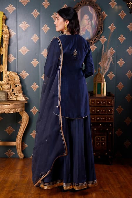 Navy blue short kurta with floral embroidered motifs and gota patti trim on the border. Comes with gharara and organza dupatta.
