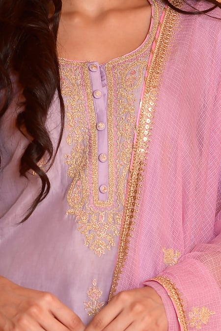 Purple kurta featuring dori embroidered floral and paisley motifs with gota lace embellishments. Paired with matching palazzo and dupatta.