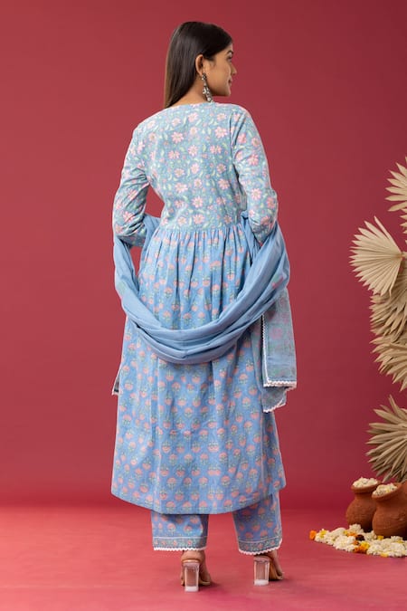 Powder blue anarkali featuring floral block print with scallop lace work. Paired with printed palazzo and a printed scallop hem dupatta.