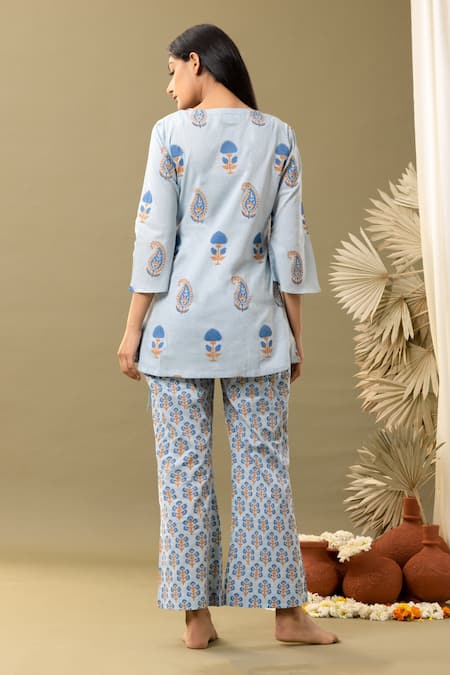 Blue angrakha featuring paisley and floral block print with side tie-up. Paired with printed flared pant with elasticated waistband.