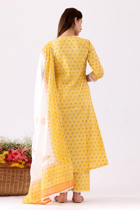 Mustard yellow anarkali featuring floral block print and crochet lace work. Paired with matching pant and a dupatta in mulmul fabric with crochet lace border.