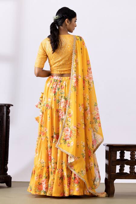 Mustard yellow tiered lehenga featuring floral digital prints. Paired with an embroidered blouse and a printed dupatta.